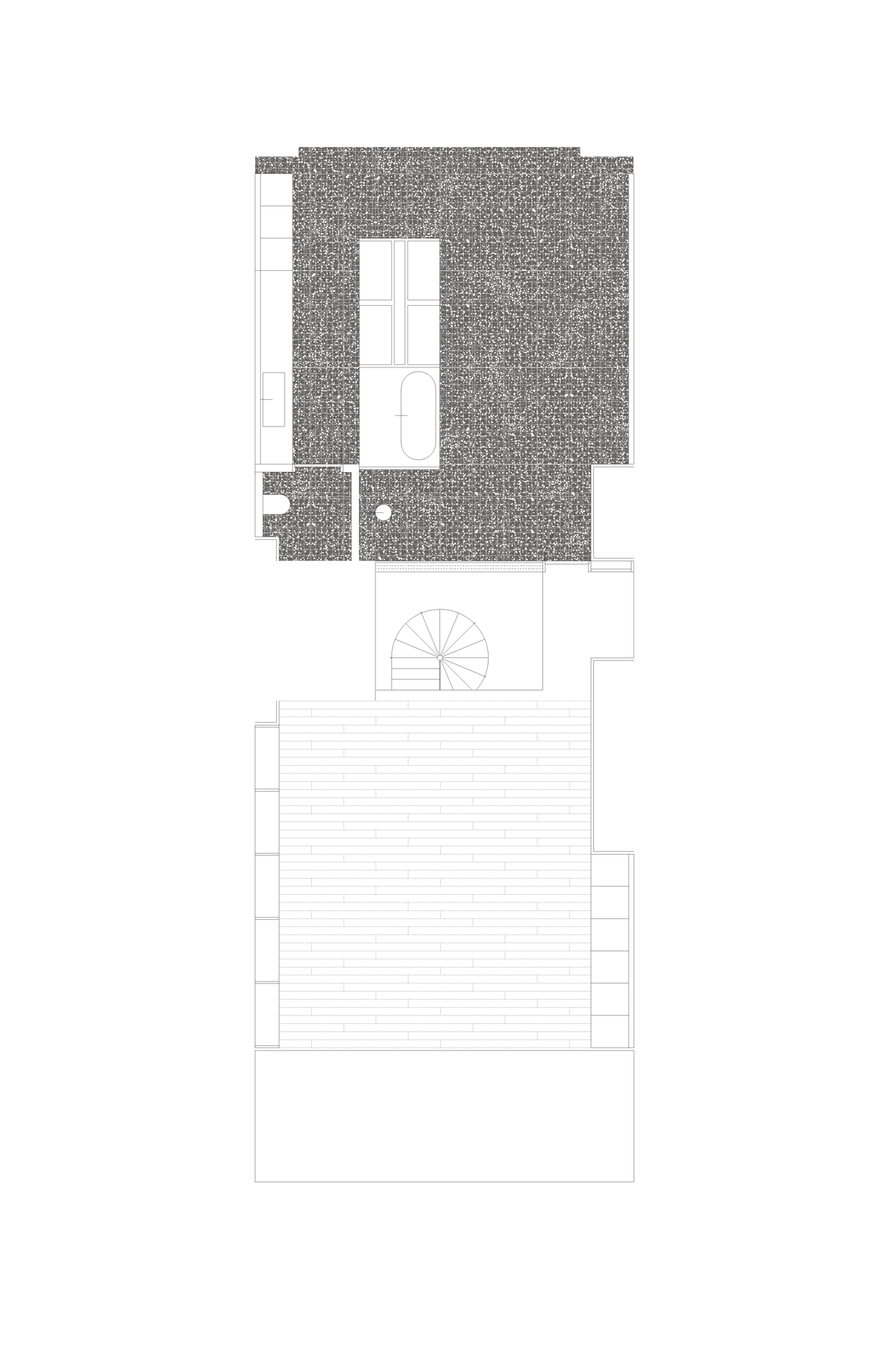 Twee verdiepingen van een duplex appartement worden herleid tot vier kamers, ze maken deel uit van dezelfde ruimte en delen daarbij hetzelfde uitzicht op de noordzee. De stalen trap speelt de centrale rol als de spil van het appartement waarrond deze vier kamers georganiseerd zijn, en tegelijkertijd visueel verbonden worden.